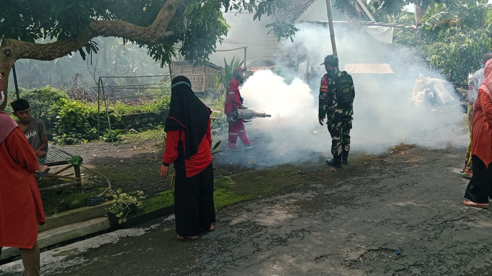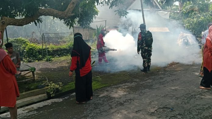 Lumajang, Dalam upaya mencegah penyebaran penyakit Demam Berdarah Dengue (DBD), Babinsa Yosowilangun Kidul Koramil 0821-11/Yosowilangun, Koptu Subaeri, turut mendampingi kegiatan fogging yang dilakukan oleh Puskesmas Yosowilangun di Dusun Krajan RT 006 RW 002, Desa Yosowilangun Kidul, Kecamatan Yosowilangun, Kabupaten Lumajang, Jawa Timur, pada Kamis (6/3/2025).