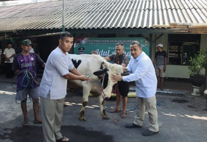 Lumajang, Memperingati Hari Raya Idul Adha 1445 Hijriyah, Kodim 0821/Lumajang menggelar acara penyembelihan hewan kurban, yang berlangsung di Makodim 0821/Lumajang, Senin (17/6/2024).