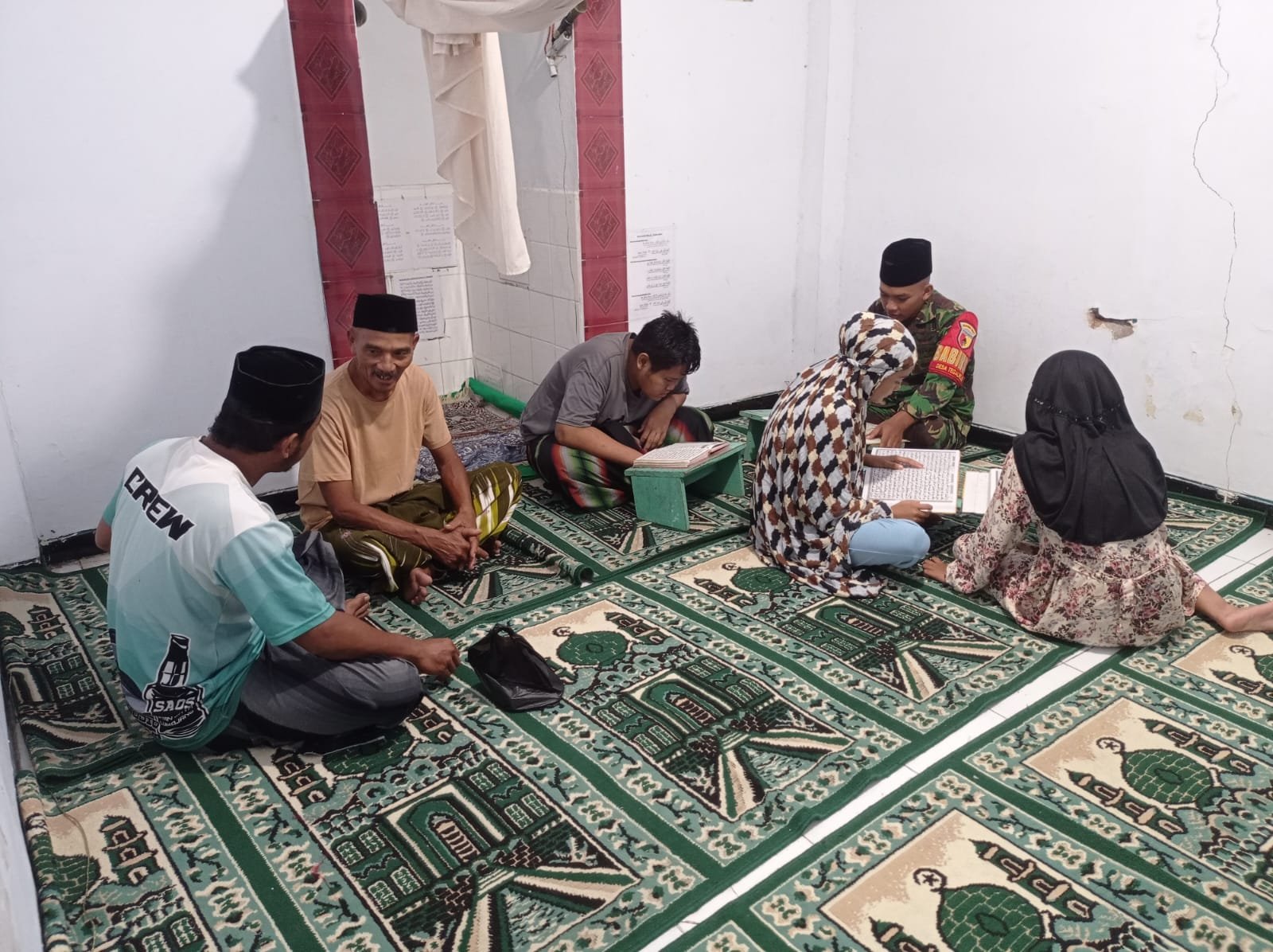 Lumajang, Menjelang berakhirnya bulan suci Ramadan, Babinsa Tegalrejo Koramil 0821-18/Tempursari, Praka Iwan Elfiriyanto, melaksanakan Komsos sekaligus tadarus bersama warga di Musala Al Iman, Dusun Tegalbanteng, Desa Tegalrejo, Kecamatan Tempursari, Kabupaten Lumajang, Jawa Timur, pada Sabtu (29/3/2025).