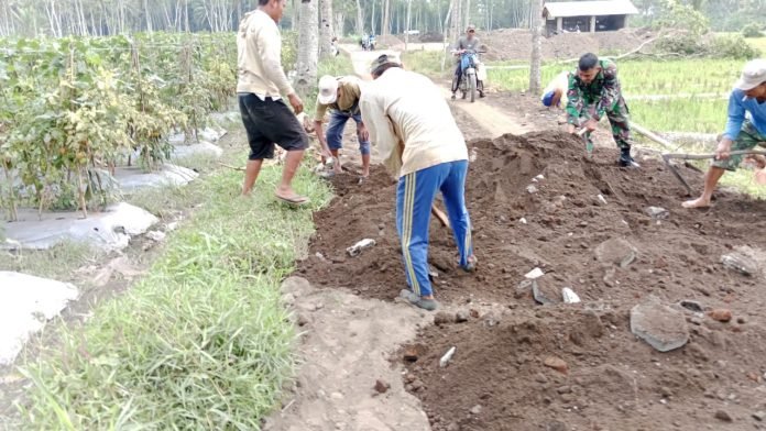 Lumajang, Dalam semangat kebersamaan dan gotong royong, Babinsa Tumpeng Koramil 0821-09/Candipuro, Sertu Antok Sujarwo, bersama warga melaksanakan kegiatan perbaikan jalan sepanjang 750 meter di Dusun Tumpeng Barat RT 002 RW 003 Desa Tumpeng, Kecamatan Candipuro, Kabupaten Lumajang, Jawa Timur, pada Sabtu (17/5/2025).