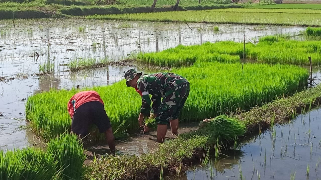 Lumajang, Dalam rangka mendukung program ketahanan pangan, Babinsa Wonosari Koramil 0821-15/Tekung, Koptu Agus Alfian, melaksanakan kegiatan pendampingan pemindahan bibit tanaman padi dari pesemaian ke lahan tanam milik Taslim, anggota Poktan Tani Mulyo di Dusun Karang Panas, Desa Wonosari, Kecamatan Tekung, Kabupaten Lumajang, Jawa Timur, pada Selasa (14/1/2025).