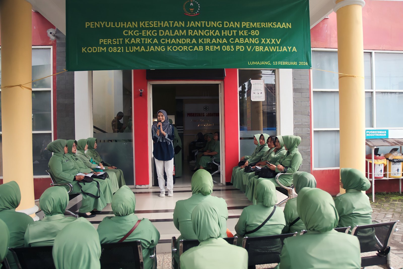 Lumajang – Dalam rangka memperingati HUT ke-80 Persit Kartika Chandra Kirana, Ny. Anita Anton bersama jajaran Persit KCK Cabang XXXV Kodim 0821 Lumajang melaksanakan kegiatan penyuluhan kesehatan jantung serta pemeriksaan VKG dan EKG di Puskesmas Rogotrunan, Kecamatan Lumajang, Jawa Timur, pada Jumat (13/2/2026).