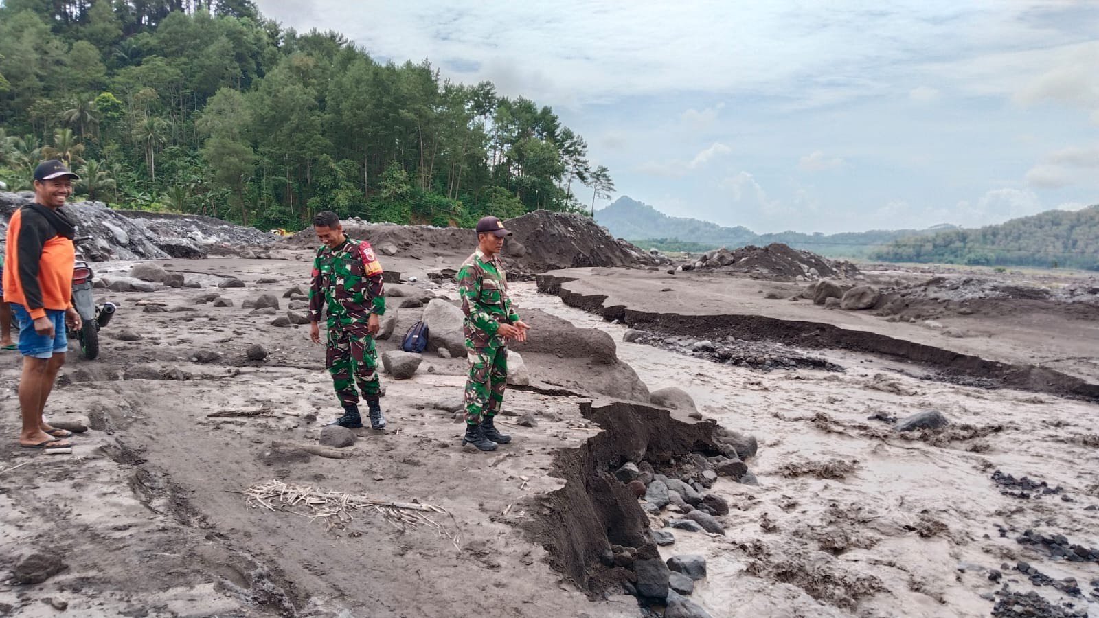 Lumajang — Sebagai bentuk respons cepat terhadap peningkatan aktivitas masyarakat di wilayah rawan bencana, personel Kodim 0821/Lumajang disiagakan untuk melakukan penyekatan sekaligus membantu kelancaran kegiatan warga di Jembatan Limpas Dusun Sumber Langsep, Desa Jugosari, Kecamatan Candipuro, Kamis (4/12/2025).