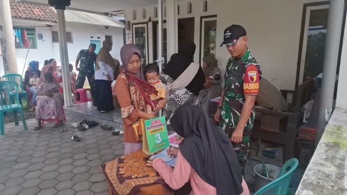 Lumajang, Dalam upaya mendukung peningkatan pelayanan kesehatan masyarakat di wilayah binaannya, Babinsa Jatimulyo Koramil 0821-13/Kunir, Serda Ary Agus Wulandono, melaksanakan pendampingan kegiatan Posyandu di Gerbangmas Euphorbia, Dusun Ampelgading, Desa Jatimulyo, Kecamatan Kunir, Kabupaten Lumajang, Jawa Timur, pada Senin (9/6/2025).