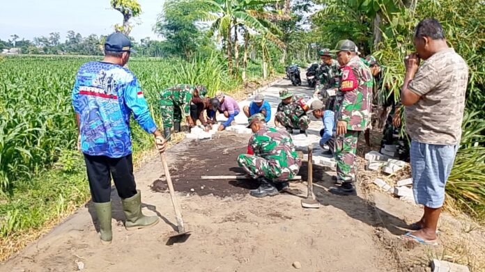 Lumajang – Enam personel Koramil 0821-11/Yosowilangun bersama 20 orang masyarakat Dusun Kebonan melaksanakan karya bakti pemasangan paving blok, menuju jalan pertanian Poktan Suko Maju di Desa Krai, Kecamatan Yosowilangun, Kabupaten Lumajang, Kamis (18/9/2025), Kegiatan ini dilaksanakan sepanjang 167 meter dengan lebar dua meter, tepatnya di Dusun Kebonan RT 004 RW 006.