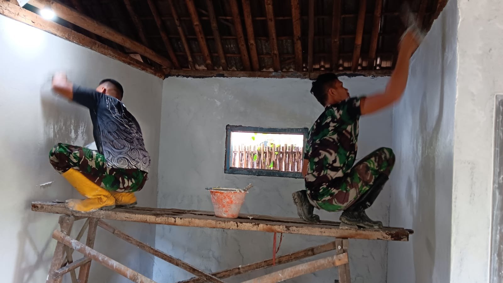 Empat anggota Satgas TMMD yang dipimpin oleh Pratu Iksan bergotong royong bersama warga untuk mewujudkan hunian yang lebih layak dan nyaman bagi keluarga penerima manfaat. Kegiatan ini merupakan bagian dari upaya TNI dalam meningkatkan kesejahteraan masyarakat melalui program TMMD yang berfokus pada pembangunan infrastruktur di daerah pedesaan.