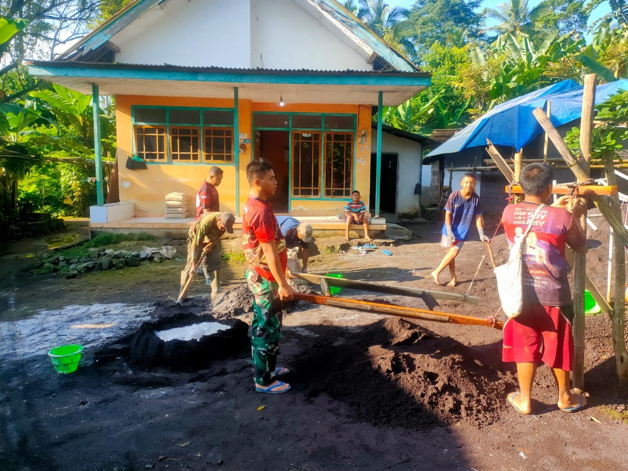Kegiatan tersebut merupakan bagian dari program TMMD yang bertujuan meningkatkan kesejahteraan masyarakat melalui pembangunan infrastruktur dan renovasi rumah bagi warga kurang mampu. Hingga saat ini, progres renovasi rumah Bapak Sekat telah mencapai 25 persen.