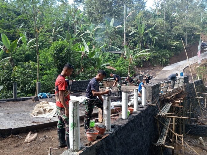 Lumajang, TMMD ke-123, Personel Satuan Tugas (Satgas) TNI Manunggal Membangun Desa (TMMD) ke-123 melaksanakan pemasangan post railing pagar jembatan di Dusun Tugu, Desa Burno, Kecamatan Senduro, Lumajang, Rabu (26/2/2025). Kegiatan ini bertujuan untuk meningkatkan keselamatan dan kenyamanan masyarakat yang melintasi jembatan.