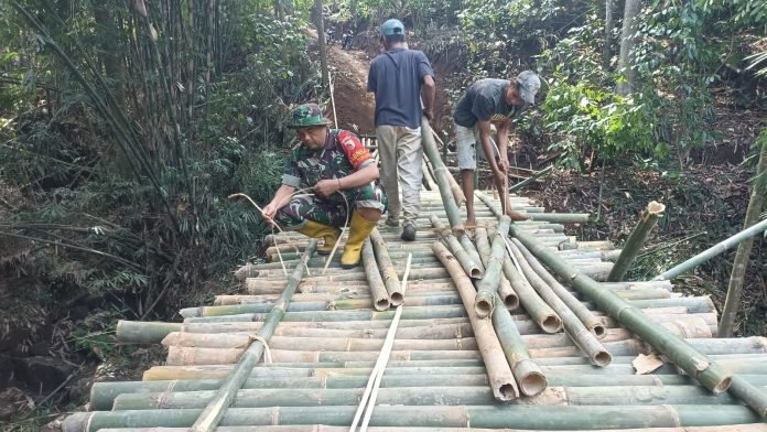 Lumajang, Upaya membangun kebersamaan, Babinsa Tunjung Koramil 0821/04 Gucialit Serka Masruri, bersama warga melaksanakan gotong royong membangun jembatan darurat dari bambu sebagai jalan alternatif di Dusun Sekar Mulyo, Desa Tunjung, Kecamatan Gucialit, Kabupaten Lumajang, Jawa Timur, pada Rabu (14/08/2024).