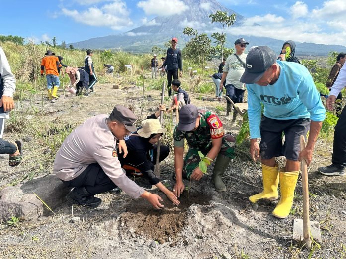 Lumajang, Dalam upaya menghijaukan kembali lahan-lahan yang terdampak erupsi Gunung Semeru beberapa tahun lalu, Babinsa Koramil 14 Pronojiwo, Serda Sigit Andi Irawan, bersama para stakeholder Supiturang dan puluhan mahasiswa Kuliah Kerja Nyata (KKN) Universitas Islam Negeri Sunan Ampel (UINSA) Surabaya melaksanakan kegiatan reboisasi di lokasi terdampak erupsi aliran Gunung Semeru Dusun Sumbersari, Desa Supiturang, Kecamatan Pronojiwo, Kabupaten Lumajang, Jawa Timur, pada Rabu (10/7/2024).