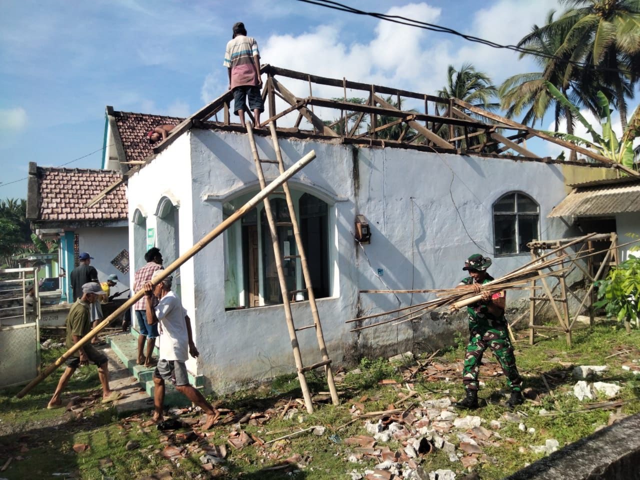 Lumajang, Babinsa Gondoruso Koramil 0821-08/Pasirian, Sertu Firdaus Dhardiansyah, memimpin kegiatan kerja bakti renovasi atap Musala Aninul Huda bersama warga Dusun Wringin Putih RT 002 RW 006, Desa Gondoruso, Kecamatan Pasirian, Kabupaten Lumajang, Jawa Timur, pada Selasa (11/11/2025).