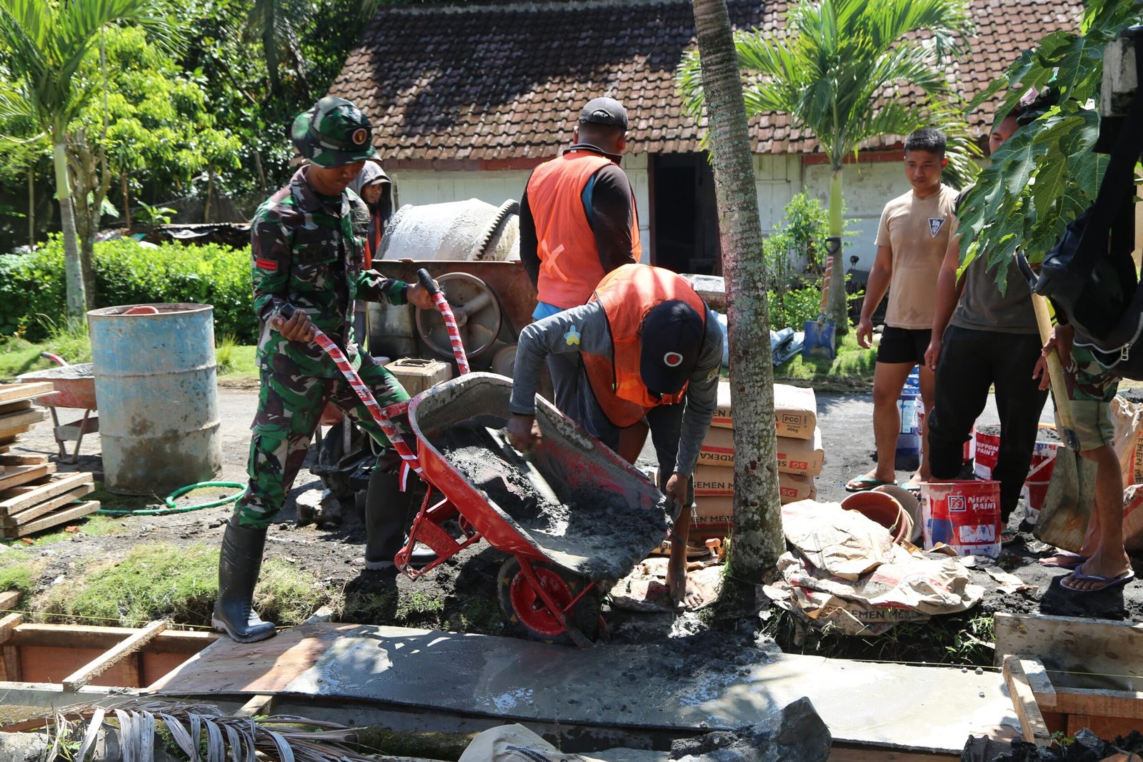 Dengan penuh semangat, Pratu Najib tak segan turun langsung ke lapangan, mengaduk semen, mengangkat batu, dan menyusun saluran air bersama masyarakat setempat. Suasana kerja penuh kekompakan itu menjadi bukti kuat bahwa semangat gotong royong masih mengakar kuat di tengah masyarakat pedesaan.