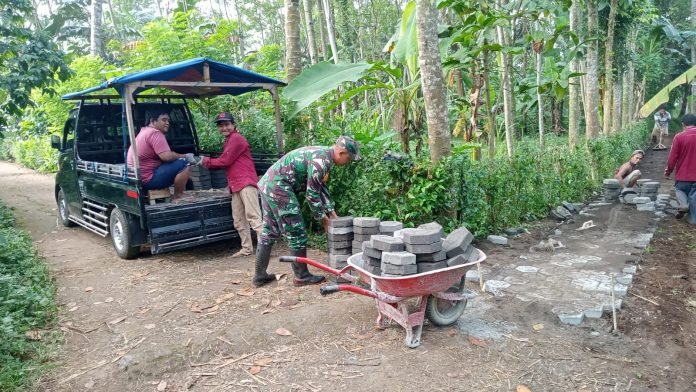 Lumajang, Dukung Kemajuan Infrastruktur Jalan Dusun, Babinsa Tegalbangsri Koramil 0821/06 Ranuyoso Sertu Mujahidin, bersama dengan warga setempat melaksanakan karya bakti pemasangan paving block sepanjang 700 meter, di jalan Dusun Krajan RT 002 RW 003 Kecamatan Ranuyoso Kabupaten Lumajang Jawa Timur, pada Senin (13/5/2024).