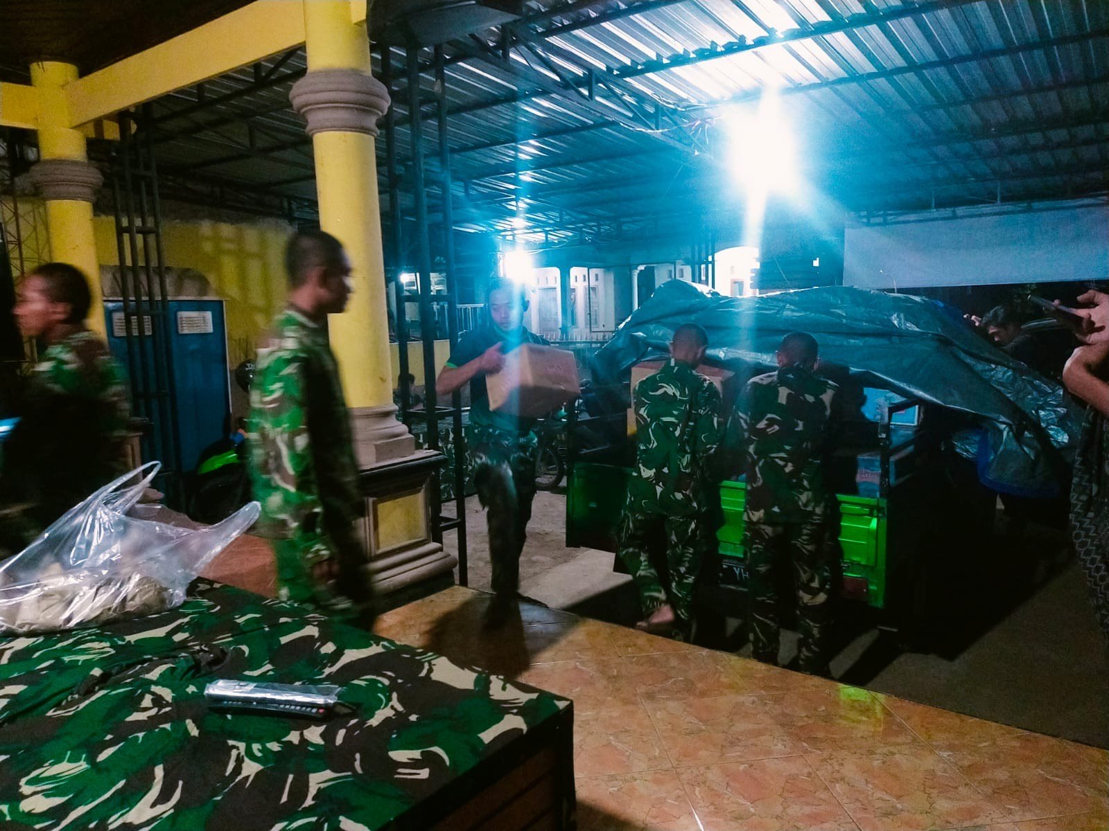 Meskipun kondisi cuaca tidak menentu dan akses menuju beberapa titik distribusi masih terhambat material vulkanik, personel TNI tetap melakukan tugasnya dengan penuh dedikasi. Di bawah penerangan seadanya, mereka saling bahu-membahu menurunkan berbagai kebutuhan pokok seperti makanan, selimut, pakaian, air bersih, serta perlengkapan harian lainnya.