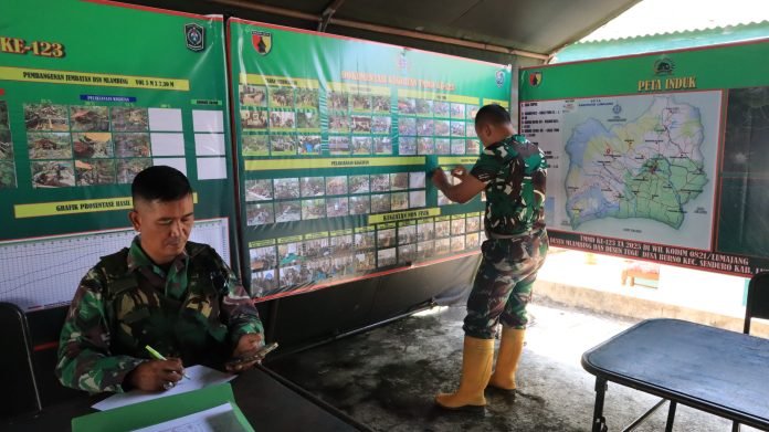Lumajang, TMMD ke-123, Dalam rangka mendukung kelancaran program TNI Manunggal Membangun Desa (TMMD) ke-123, Sertu Irawan, anggota Staf Terr Kodim 0821/Lumajang, melaksanakan pemasangan dokumentasi hasil TMMD di Pos Kotis yang terletak di Dusun Mlambing, Desa Burno, Kecamatan Lumajang. Kegiatan ini merupakan bagian dari upaya untuk memonitor dan mendokumentasikan setiap perkembangan yang terjadi selama pelaksanaan TMMD.