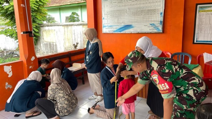 Lumajang, Bentuk komitmen dalam mendukung program kesehatan masyarakat, Babinsa Nogosari Koramil 0821-16/Rowokangkung, Serda Agus Setiawan, melaksanakan pendampingan kegiatan imunisasi dan pengobatan gratis di Posyandu Nusa Indah, Balai Desa Nogosari, Kecamatan Rowokangkung, Kabupaten Lumajang, Jawa Timur, pada Sabtu (12/7/2025).