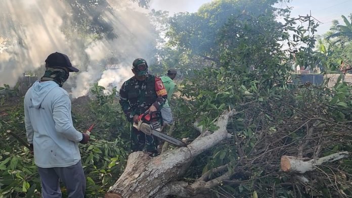 Kegiatan berjalan lancar dan penuh kekompakan. Warga tampak antusias membersihkan semak belukar dan membantu memotong pohon yang dianggap berpotensi membahayakan.