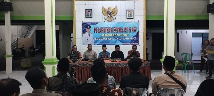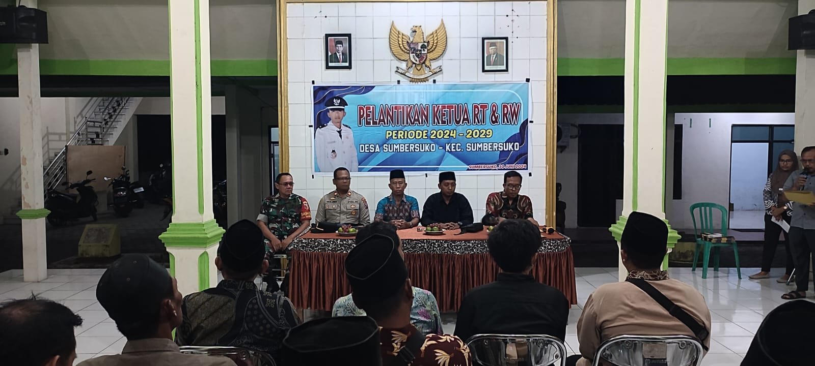 Lumajang, Pemerintah Desa Sumbersuko menggelar acara pelantikan Ketua Rukun Tetangga (RT) dan Ketua Rukun Warga (RW) yang baru di Balai Desa Sumbersuko Kecamatan Sumbersuko Kabupaten Lumajang, Jawa Timur, pada Minggu (30/6/2024) malam. Acara tersebut Babinsa Sumbersuko Koramil 0821/19 Sumbersuko, Serda Warsono, yang hadir mewakili Danramil Sumbersuko.