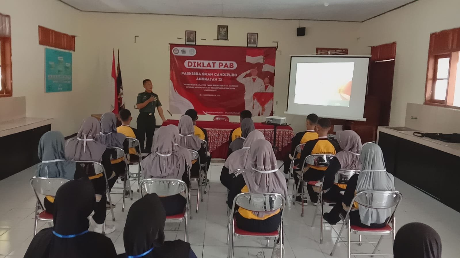 Lumajang, Dalam rangka membentuk generasi muda yang berkarakter, disiplin, dan berjiwa nasionalisme, Bati Tuud Koramil 0821-09/Candipuro, Pelda Baidlowi Abdullah, memberikan materi kedisiplinan pada kegiatan Pendidikan dan Pelatihan (Diklat) Pengukuhan Anggota Baru (PAB) Paskibraka Angkatan IX di SMA Negeri Candipuro, Kecamatan Candipuro, Kabupaten Lumajang, Jawa Timur, Sabtu (11/1/2025).