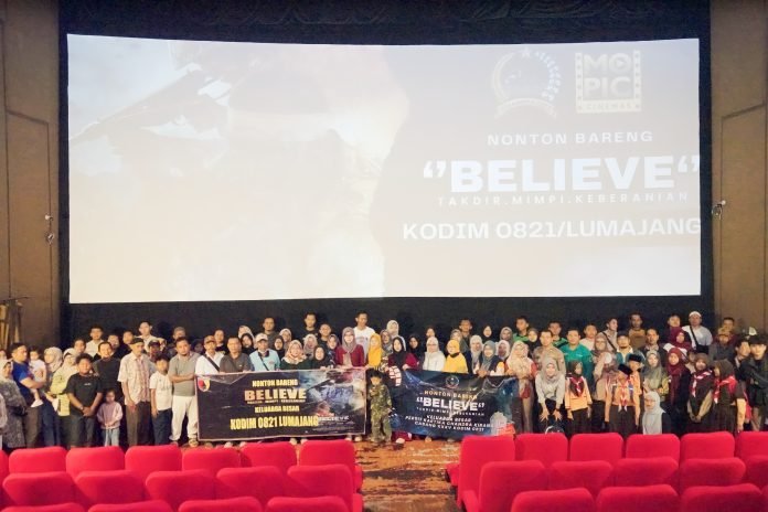 Lumajang. Dalam rangka menumbuhkan rasa cinta tanah air, jiwa patriotisme, serta membangun optimisme generasi muda, Kodim 0821/Lumajang menggelar kegiatan nonton bareng (nobar) film BELIEVE berjudul “Takdir, Mimpi dan Keberanian”, Sabtu bertempat di Bioskop Mopic Cinema Lumajang, Jl. Panglima Besar Sudirman Lt.2, Tompokersan. Sabtu(9/8/2025)