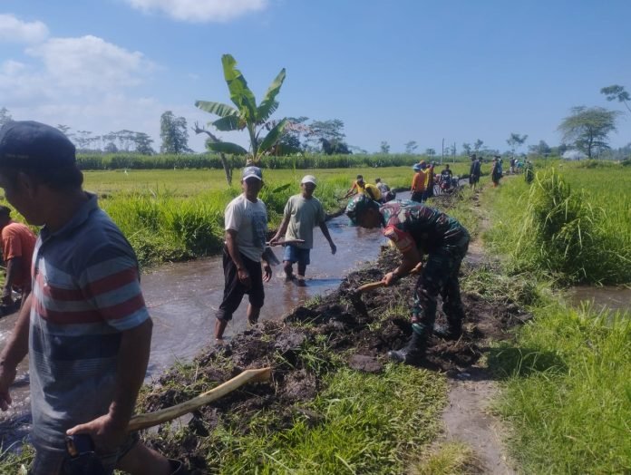 Lumajang, Dalam upaya mendukung peningkatan produktivitas pertanian, Babinsa Pandanwangi Koramil 0821-10/Tempeh, Kopda Bayu Agung, melaksanakan pendampingan kegiatan kerja bakti pelebaran saluran irigasi bersama perangkat desa dan warga Dusun Krajan 3, Desa Pandanwangi, Kecamatan Tempeh, Kabupaten Lumajang, Jawa Timur, pada Minggu (6/4/2025).