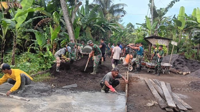 Lumajang, TMMD ke-123, Sebagai bagian dari program TNI Manunggal Membangun Desa (TMMD) ke-123, Serma Edy bersama 30 personel TMMD dan masyarakat Desa Burno bergotong royong melaksanakan pengecoran jalan penghubung antara Dusun Mlambing dan Dusun Tugu, Kecamatan Senduro, Lumajang, Senin (10/3/2025).