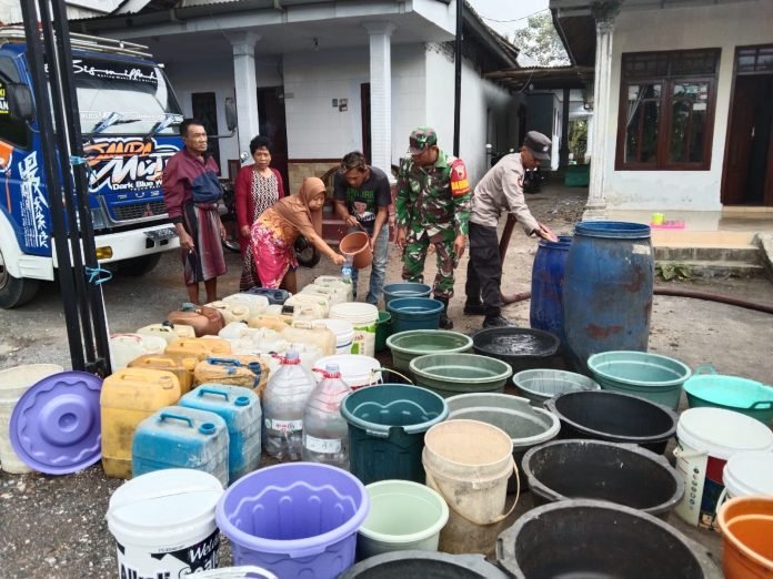 Lumajang, Dalam upaya membantu warga yang terdampak kekeringan, Babinsa Merakan Koramil 0821-20/Padang, Serda Joni Sugiarto, bersama Babinkamtibmas Merakan, melaksanakan kegiatan pendistribusian bantuan air bersih di Dusun Lor Curah RT 020 RW 004, Desa Merakan, Kecamatan Padang, Kabupaten Lumajang, Jawa Timur, pada Jumat (23/8/2024).