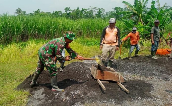 Lumajang, Wujud nyata kepedulian terhadap pembangunan infrastruktur desa, Babinsa Sukosari Koramil 0821-12/Jatiroto, Serka Samsuliadi Dwi Purwanto, turut mendampingi dan membantu proses pembangunan jembatan penghubung antar dusun di Desa Sukosari, Kecamatan Jatiroto, Kabupaten Lumajang, Jawa Timur Senin (7/4/2025).
