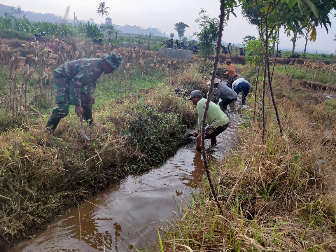 TNI] Babinsa Dawuhan Wetan, Bersama Warga Kerja Bakti Pembersihan Irigasi Tersier