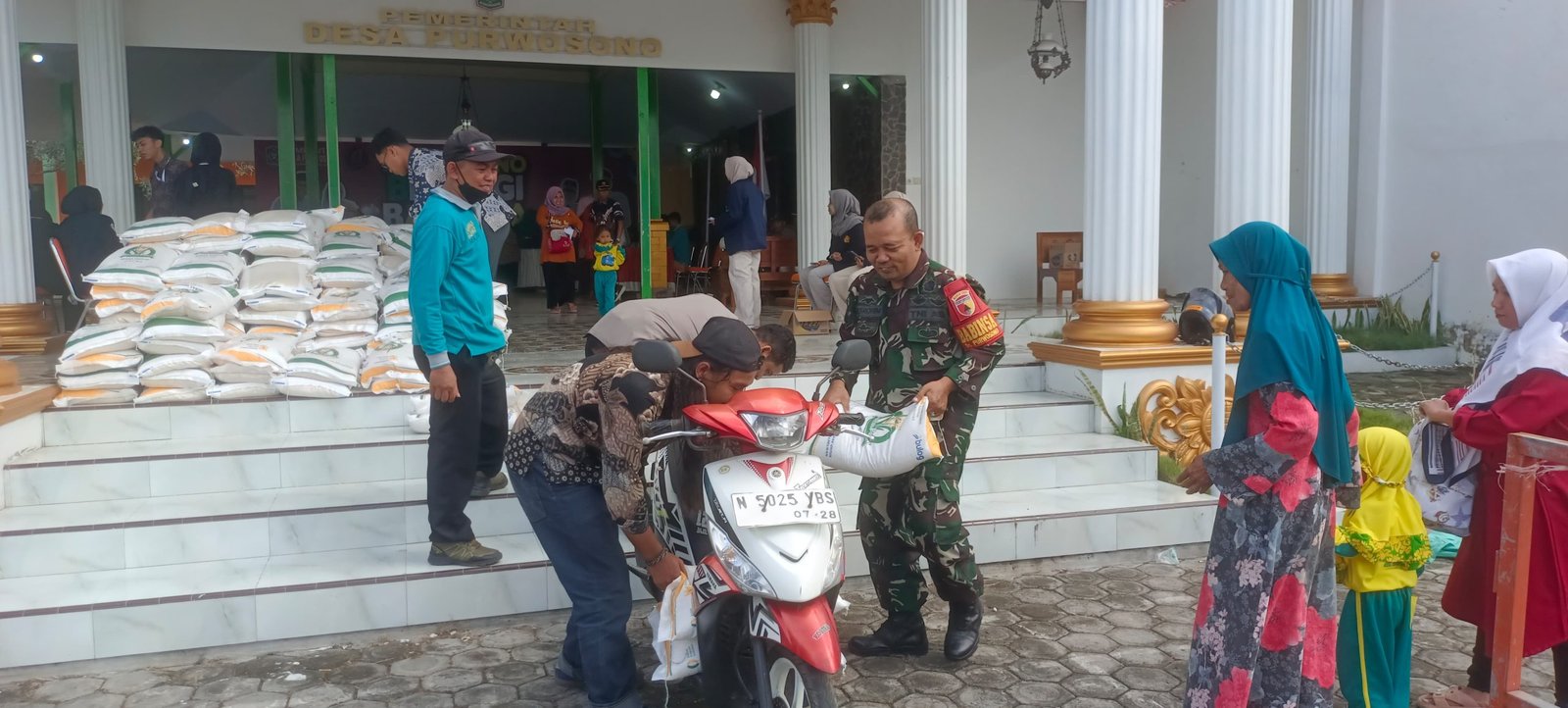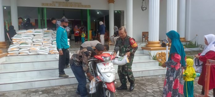 Lumajang, Dalam rangka mendukung ketahanan pangan dan meringankan beban masyarakat, Babinsa Purwosono Koramil 0821-19/Sumbersuko, Serka Masrohim Atmajaya Putra, melaksanakan pendampingan kegiatan penyaluran bantuan pangan berupa beras kepada warga di Balai Desa Purwosono, Kecamatan Sumbersuko, Kabupaten Lumajang, Jawa Timur. Senin (4/8/2025).