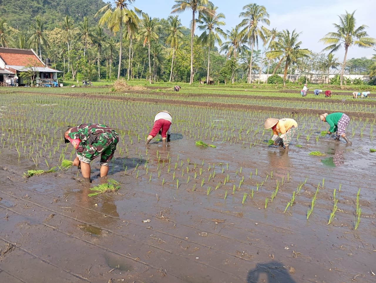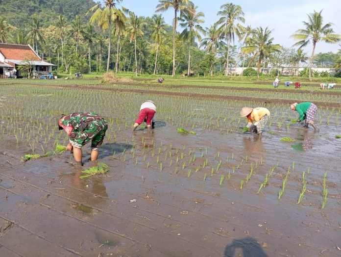 Lumajang, Dalam upaya mendukung ketahanan pangan di wilayah binaannya, Babinsa Nguter Koramil 0821-08/Pasirian, Sertu Eko Prasetyo, turut serta dalam kegiatan tanam padi bersama petani di Dusun Bulak Gempol, Desa Nguter, Kecamatan Pasirian, Kabupaten Lumajang, Jawa Timur, pada Sabtu (22/2/2025).