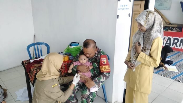 Lumajang, Dalam upaya meningkatkan kesehatan Balita, Babinsa Purwosono Koramil 0821-19/Sumbersuko, Sertu Masrohim Atmajaya Putra mendampingi Bidan Desa melaksanakan kegiatan pelayanan Posyandu Nusa Indah di Dusun Selokambang RT 005 RW 002 Desa Purwosono, Kecamatan Sumbersuko, Kabupaten Lumajang, Jawa Timur, pada Kamis (26/12/2024).