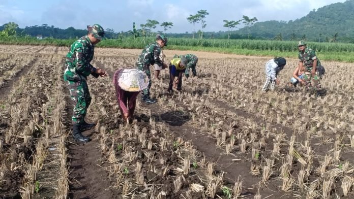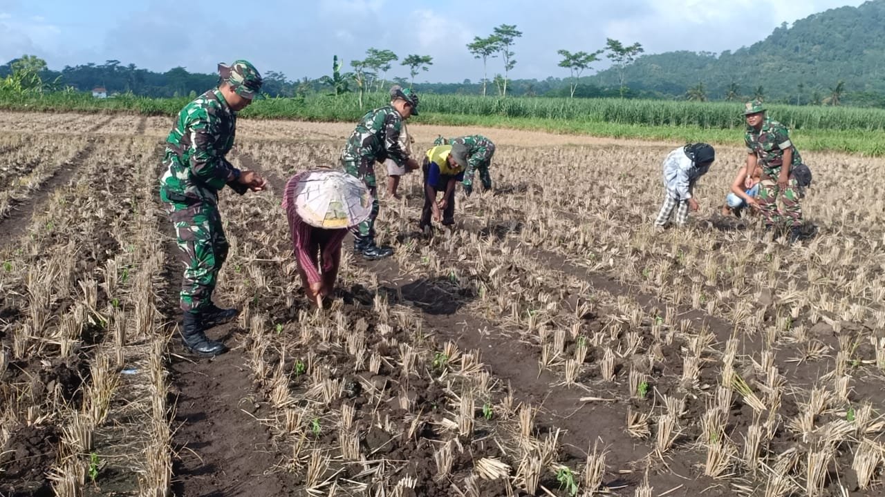 Lumajang, Dalam upaya memperkuat ketahanan pangan di wilayahnya, Koramil 0821/05 Klakah yang dipimpin oleh Danramil Lettu Inf Poniran, turut serta dalam kegiatan penanaman jagung serentak di lahan milik kelompok tani Gunung Makmur, Dusun Gunung Dulang Desa Kebonan Kecamatan Klakah Kabupaten Lumajang, Jawa Timur, Senin (22/4/3024).
