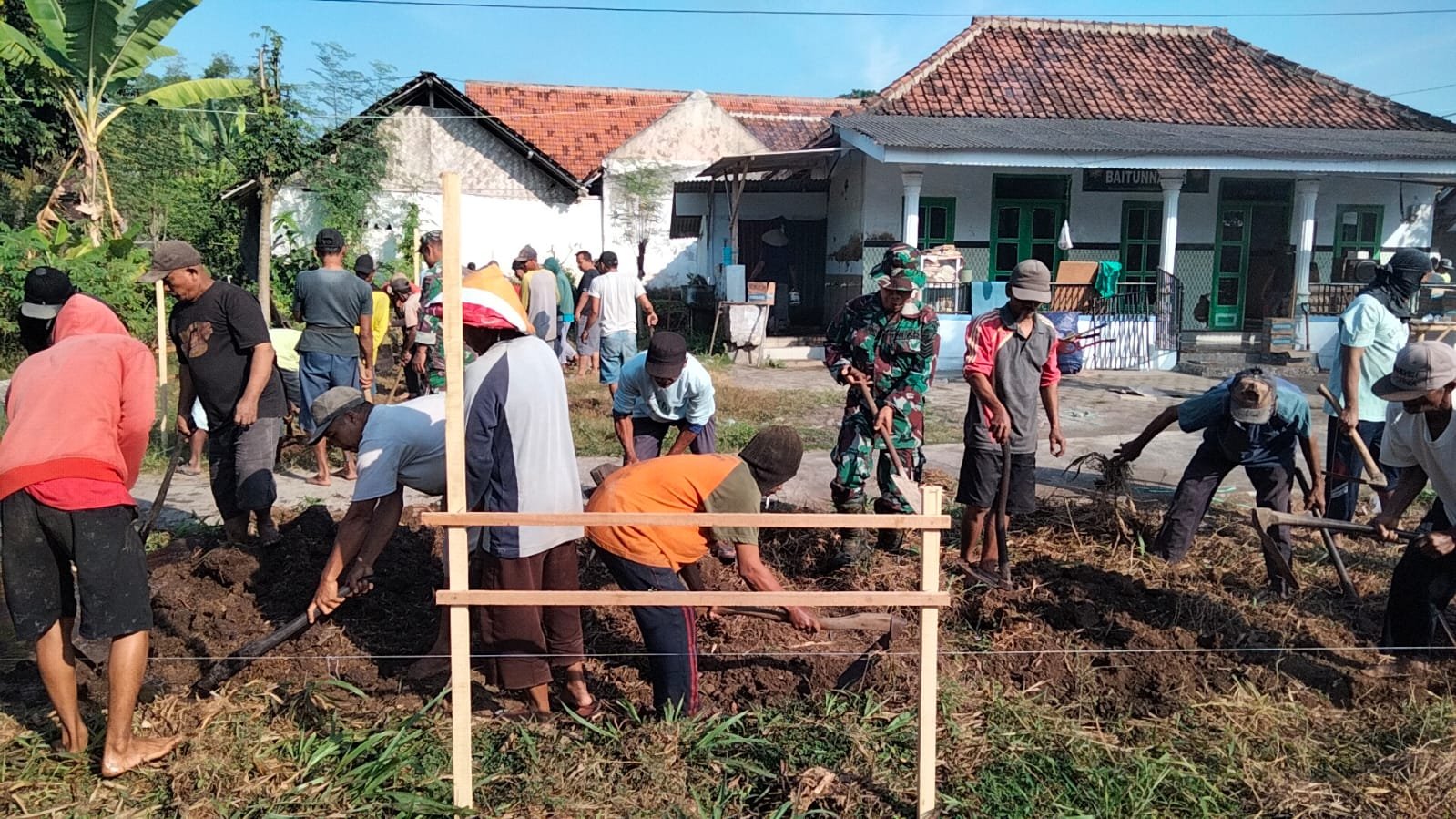 Lumajang,Dalam rangka mendukung pembangunan infrastruktur keagamaan dan membantu masyarakat setempat, personel Koramil 0821/16 Rowokangkung berpartisipasi dalam kegiatan Karya Bakti Pembangunan Masjid Baitun Najah di Dusun Rowoasri, RT 011 RW 010, Desa Rowokangkung, Kecamatan Rowokangkung, Kabupaten Lumajang, Jawa Timur, Sabtu (29/6/2024).