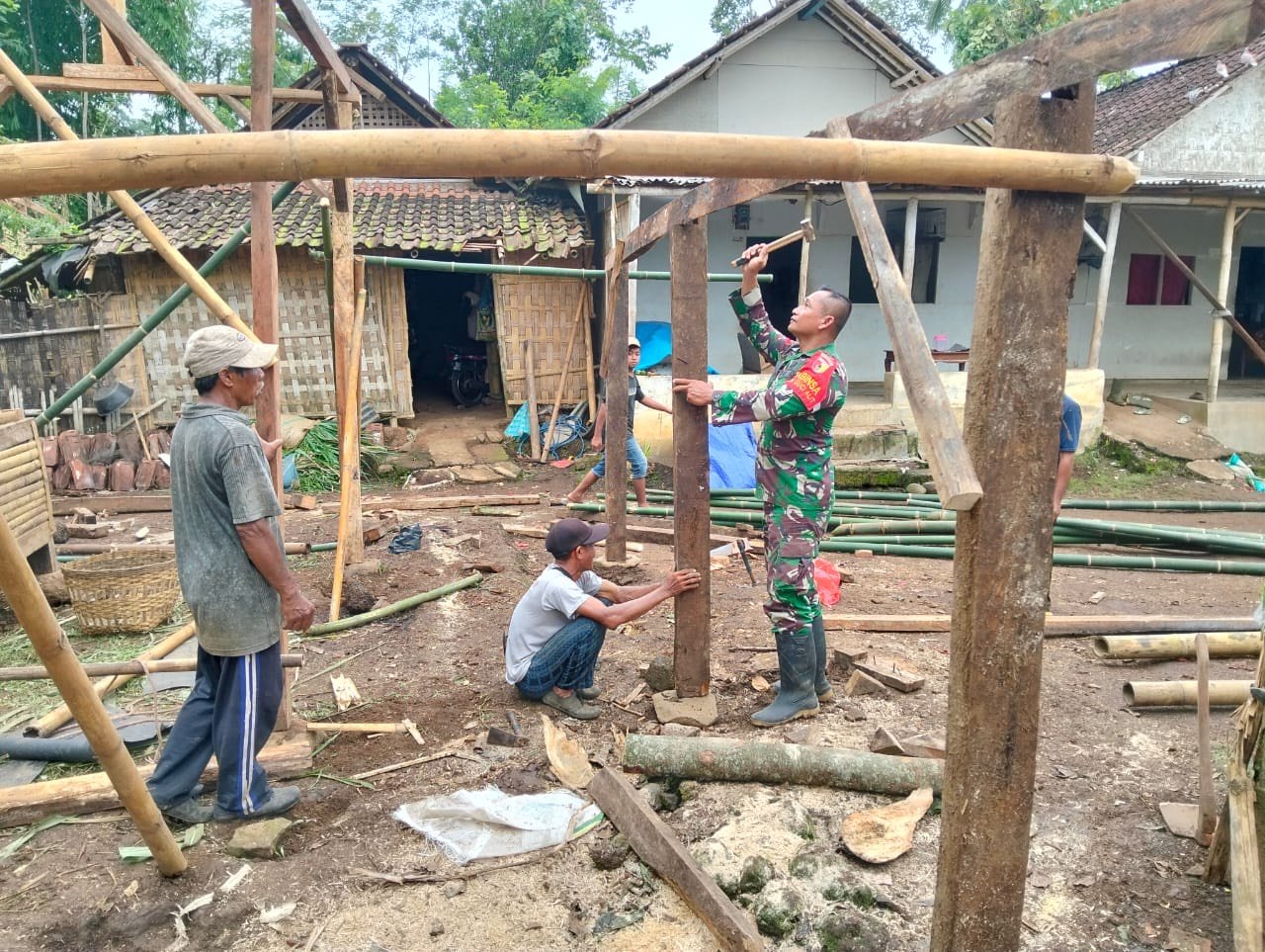 Lumajang, Wujud kebersamaan dan kedekatan TNI dengan masyarakat kembali tampak dalam kegiatan gotong royong. Babinsa Gucialit Koramil 0821-04/Gucialit, Koptu Abdul Halik Baso, bersama warga setempat melaksanakan kerja bakti membangun kandang sapi milik Ari Wicaksono, salah satu warga Dusun Sidodadi RT 004 RW 010, Desa Gucialit, Kecamatan Gucialit, Kabupaten Lumajang, Jawa Timur, pada Rabu (10/12/2025).