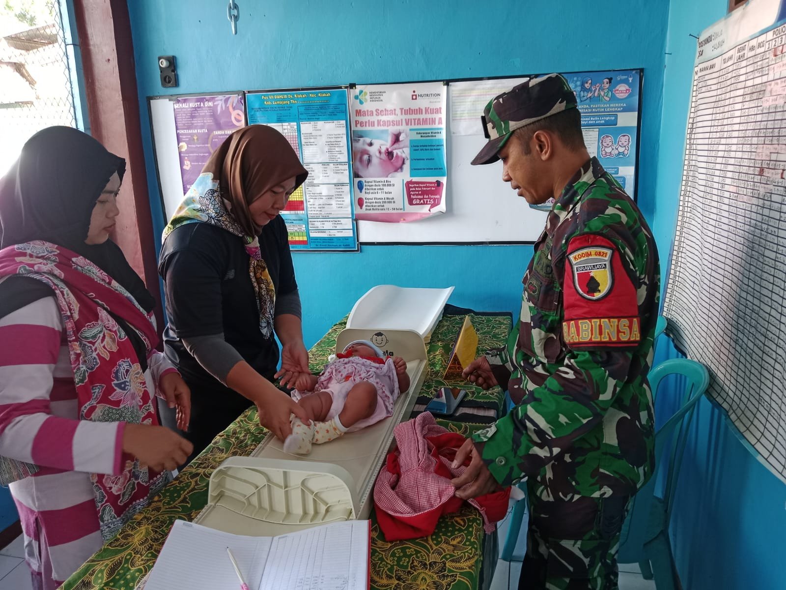 Lumajang, Sebagai bentuk nyata kepedulian terhadap kesehatan masyarakat, Babinsa Sumberwringin Koramil 0821-05/Klakah, Sertu Yudiono, melaksanakan pendampingan kegiatan monitoring kesehatan balita di Posyandu Baugenville, Dusun Sumur RT 001 RW 002 Desa Sumberwringin, Kecamatan Klakah, Kabupaten Lumajang, Jawa Timur, pada Senin (7/7/2025).
