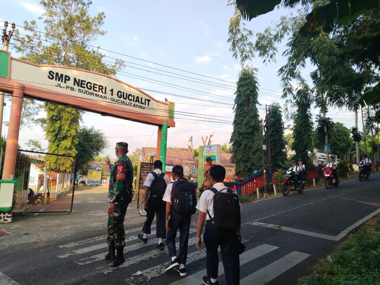 Lumajang, Babinsa Gucialit Koramil 0821/04 Gucialit, Serda M. Agus Arifin, menunjukkan dedikasinya kepada masyarakat dengan membantu penyebrangan anak sekolah di SMPN 01 Gucialit, Kecamatan Gucialit, Kabupaten Lumajang, Jawa Timur, pada Kamis (25/7/2024), Kegiatan yang dilakukan untuk memastikan keselamatan siswa dan siswi saat menyeberang jalan menuju sekolah, serta mengurangi risiko kecelakaan lalu lintas pada anak sekolah.