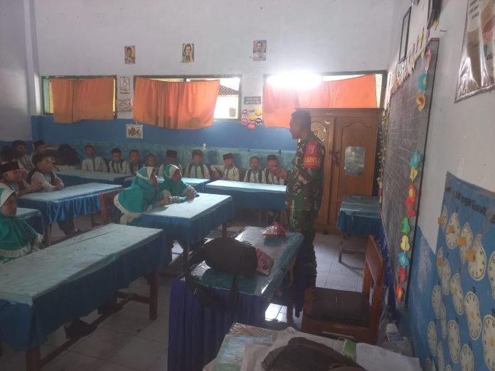 Lumajang, Guna menanamkan nilai-nilai cinta tanah air sejak dini, Babinsa Kebonsari Koramil 0821-19/Sumbersuko, Kopda Hendra Setiawan, melaksanakan kegiatan pembinaan Wawasan Kebangsaan (Wasbang) dan pembelajaran tematik kepada siswa kelas 2 di SD Negeri Kebonsari, Kecamatan Sumbersuko, Kabupaten Lumajang, Jawa Timur, pada Kamis (22/5/2025).