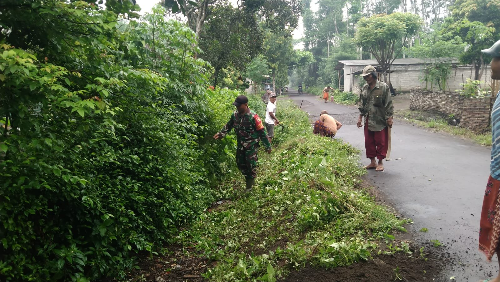Lumajang, Babinsa Tempeh Kidul Koramil 0821/10 Tempeh Serka Zainul Arifin, bersama masyarakat melaksanakan kerja bakti membersihkan rumput di kiri-kanan jalan di Dusun Wonomerto Kidul RT 005 RW 004 Desa Tempeh Kidul Kecamatan Tempeh Kabupaten Lumajang, Jawa Timur, Rabu (13/3/2024).