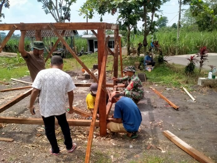 Wujudkan Siskamling Aktif, Babinsa Dadapan Dampingi Pembuatan Poskamling