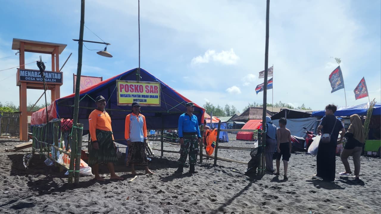 Lumajang, Dalam rangka menjaga keamanan dan kenyamanan pengunjung selama masa libur Lebaran, Babinsa Wotgalih Koramil 0821-11/Yosowilangun, Peltu Guntur Rudi Purwanto, bersama stakeholder Desa Wotgalih melaksanakan kegiatan pemantauan di kawasan wisata Pantai Mbah Drajid, Desa Wotgalih, Kecamatan Yosowilangun, Kabupaten Lumajang, Jawa Timur, pada Minggu (6/4/2025).